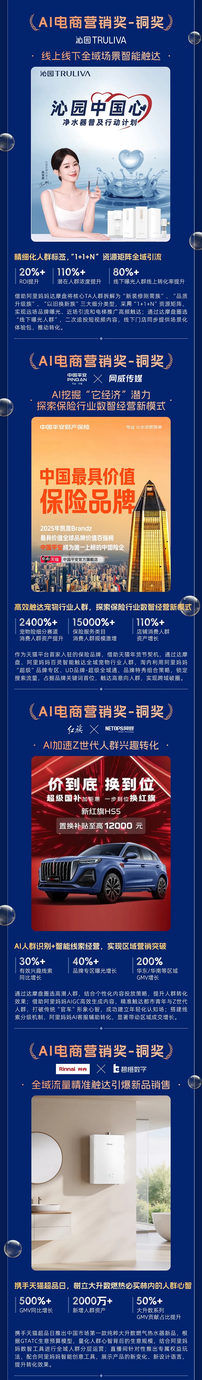 ![]() 作为自1968年成立以来便享誉全球的营销权威奖项,艾菲奖始终致力于通过专业、精准的全球评审团层层筛选,表彰最具实效的营销创意与实践者,以一流见解引领行业发展。 在AI技术裂变式发展、全面渗透电商产业链的行业拐点,2025年4月,艾菲奖与阿里妈妈正式达成战略合作,创新性地共同设立「艾菲AI电商营销奖」,旨在表彰AI技术在电商营销领域的创新实践,助力行业智能化升级。 此次获奖阵营覆盖家电、美妆、服饰、汽车、保险等多个核心领域。通过AI驱动的精准营销与全域品效联动,德龙荣获「AI电商营销奖」AI受众精准定向类目金奖、AI私域资产类目银奖;高梵荣获「AI电商营销奖」全域品效类目金奖、高效转化类目银奖;SK-II、美的凭借各自在AI人货运营、内容创新等领域的卓越表现,亦同时获得「AI电商营销奖」银、铜两个奖项;沁园、平安产险、红旗、林内等品牌以创新性经营实践荣获「AI电商营销奖」铜奖。 值得关注的是,阿里妈妈自有AI产品同样实力出圈。阿里妈妈AIGC创意荣获「效果营销奖」银奖、「大艾菲奖」铜奖,阿里妈妈达摩盘荣获「效果营销奖」银奖,阿里妈妈AI小万荣获「效果营销奖」铜奖、「大艾菲奖」铜奖,人群推广「人群仪表盘」荣获「大艾菲奖」铜奖,全方位印证了阿里妈妈“让每一份经营都算数”的核心理念,更彰显了其在AI技术研发、产品落地与商业助力上的强劲实力。 ![]() ![]() ![]() ![]() ![]() ![]() 艾菲奖的榜单,不仅是对品牌营销实效的权威认证,更折射出AI时代电商经营的核心趋势。此次获奖品牌携手阿里妈妈AI能力,在存量竞争中精准破解人群触达、心智占领、品效转化等关键难题。从高端家电到美妆护肤,从服饰穿搭到汽车保险,品牌们借助达摩盘精准人群圈选、AIGC内容创新、全域链路协同等能力,构建经营闭环,共同勾勒出AI驱动下电商增长的全新蓝图。 ![]() 中国咖啡机市场年增速超20%,本土与新兴品牌靠低价策略掀起红海竞争,高端市场陷入价格与心智双线混战。更关键的是,用户行为分散于公私域,不同平台数据难以流通,导致咖啡机品类商家高营销价值人群精准触达难、TA浓度低。 为了高效链接咖啡机升级换新人群、咖啡爱好人群及品质生活家等核心目标人群,德龙携手WPP Media,以AI技术为核心,分阶段搭建高精度人群资产体系。第一阶段,品牌利用阿里妈妈隐私计算框架SDH(Secure Data Hub),采用PSI(Private Set Intersection)技术,打通公域推广行为与阿里达摩盘标签人群,建模生成“增补人群包1.0”,精准定位高潜人群;第二阶段引入真实消费数据(品牌CRM数据),结合店铺核心目标升级构建“增补人群包2.0”,显著提升UD品牌推广效能。在此基础上,德龙融合CRM高营销价值人群、公域推广互动人群与淘系“咖啡机搜索/加购”行为数据,锁定品质生活、居家、慢生活、家庭聚会、早餐、礼赠等六大场景人群,通过场景需求、创意内容与产品卖点的强匹配,推动转化效率跃升。 通过“定向投放-行为追踪-私域沉淀”的长效运营链路,德龙全域GMV同比增长50%,ROI大幅提升至3.5,目标人群品牌关键词搜索量增长2倍,“进口咖啡机”品类心智占有率持续攀升,荣获「AI电商营销奖」金、银双奖。 ![]() 面对消费人群“高端必选国际品牌”的惯性思维,国内羽绒服品牌常常在高端化转型过程中遇到心智突围难、高营销价值新客获取难等挑战,亟需找到破局路径。 为扭转消费人群“⾼端必选国际品牌”的惯性思维,在行业中突出重围,高梵以“中国高端鹅绒服”为核心定位,携手杭州十禾,依托阿里妈妈“生意参谋”的“行业洞察”模块,针对不同人群痛点打造差异化关键词——黑珍珠系列主打“巴黎高定×明星同款”,高梵风壳系列聚焦“时尚美学×户外场景”,未来羊毛系列突出“未来羊毛创新面料×实用主义”。大促期间,品牌以“杨幂同款黑金鹅绒服”为核心,通过手淘开屏+品牌特秀+ShowMAX组合强势曝光,借助Uni Desk将淘外流量高效导入淘内店铺,以“高端鹅绒服”种草视频引流,配合货品全站推等效果推广工具加速成交。 最终,品牌GMV同比增长超130%,明星同款黑金系列曝光量破1000万,曝光新客贡献占比超50%,成功建立“中国高端鹅绒服”心智,荣获「AI电商营销奖」金、银双奖。 ![]() 对于美妆市场而言,高端品牌已经进入存量竞争阶段,人均比价APP使用时长增长40%,品牌面临人群资产扩容与ROI提升的双重压力。 在这种情况下,SK-II年轻客群断层问题突出;品牌自播还存在转化效率不足的困境,虽有流量渗透但难以拉动全店营收增长。为寻找破局策略,SK-II联合乐其集团,以“情感化内容+AI全域运营”为核心,制定经营策略。首先,绑定五月天“爱只向你”主题,定制歌词瓶、拍立得等情感载体,通过全网APP开屏、核心商圈大屏实现亿级曝光,再借助阿里妈妈红猫计划、星伴计划及Uni Desk,锁定全域高营销价值人群,精准扩圈年轻人群;其次,淘内通过货品全站推智能提升进店率,直播间内用AI话术生成工具优化主播表达,打造“线上专柜”体验,同时设计“直播闪降”专属价与3%-8%波段化平台券补贴,错峰避开同行业品牌达播高峰,推动流量高效转化。 618期间,SK-II全周期净成交增速超100%,AIPL人群增长超20%,ROI提升50%+,重塑高端美妆全域营销范式,成功摘得「AI电商营销奖」银、铜双奖。 ![]() 今年,在国家推出3000亿以旧换新政策下,超1亿政策敏感人群