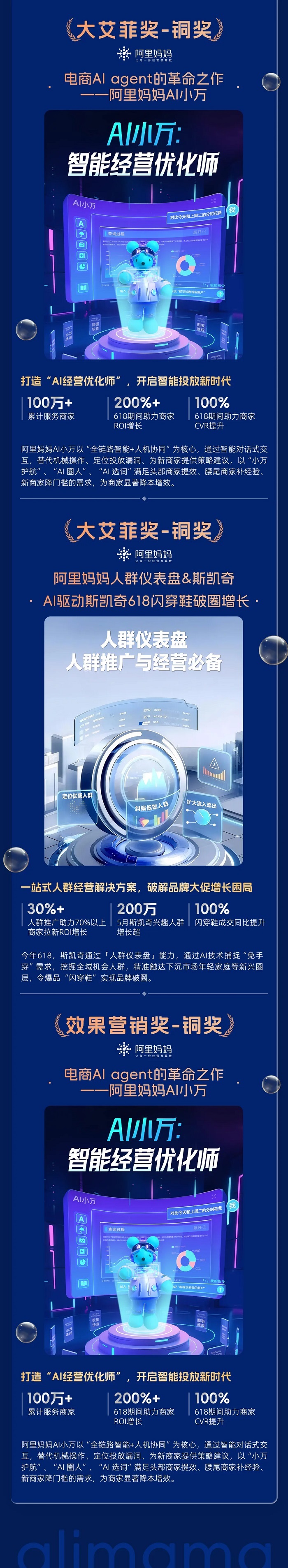 阿里妈妈信息流&广告创意中心产品负责人奇果 ![]() 阿里妈妈达摩盘在“数智化人群运营”持续发力,为品牌打造全域种搜一体化方案。某户外运动品牌借助达摩盘数智分析,深度洞察25-34岁“专业玩家”、18-24岁“运动潮流爱好者”的需求偏好,将产品功能卖点转化为“场景穿搭解决方案”,降低消费人群理解门槛;通过“内容方向定调+动态投放优化+精选人群分层”三维联动,构建KOC铺量测款、腰部KOL转化打爆、尾部KOL素材扩散的组合式种草矩阵;叠加品效联投与站内聚焦投放,全域夯实老客、拉新潜客、孵化高粘性MVP人群,同时依托实时监控、全域归因与智能诊断,动态优化投流策略,实现科学提效。 618期间,品牌天猫官旗GMV同比增长超100%,成功跻身亿元俱乐部;淘内外搜索量同比增长超150%,累计获取5000万级优质人群资产,夺得「效果营销奖」银奖。 ![]() ![]() 阿里妈妈成功搭建全链路智能投放助手AI小万,推动电商投放向人机协同革命性转型。AI小万以“全链路智能+人机协同”为核心,通过智能对话式交互,替代机械操作、定位投放漏洞、为新商家提供策略建议,以“小万护航”、“AI圈人”、“AI选词”满足头部商家提效、腰尾商家补经验、新商家降门槛的需求,为商家显著降本增效。截至2025年6月,AI小万累计服务商家已超100万,618期间助力商家ROI增长200%+,CVR提升100%,进一步印证了其在商家中的高使用率和广泛影响力,分别获得「效果营销奖」铜奖、「大艾菲奖」铜奖。 ![]() 阿里妈妈万相台AI无界人群推广全新上线的「人群仪表盘」,可以帮助品牌更高效地实现爆品破圈,助力70%以上商家拉新ROI增长30%以上。今年618,斯凯奇携⼿阿⾥妈妈AI⼈群能⼒,精准破解了⼈群破圈难题。一方面,通过达摩盘AI圈人「AI全域洞察」能力,针对年轻化和家庭场景消费诉求智能输出精准人群画像并一键投放,搭配人群推广「人群仪表盘」挖掘“俏丽职场新主角”、“活力焕发自在客”等全域机会人群。同步以AI能力捕捉“免手穿”需求,精准触达下沉市场年轻家庭等新兴圈层。另一方面,凭借人群推广「智能竞争航线」定向功能,高效追踪触达同行业品牌人群,提升同行内人群渗透率,最终令爆品“闪穿鞋”成功实现品牌破圈,品牌5月兴趣人群增长超200万,闪穿鞋618期间成交同比提升100%,荣获「大艾菲奖」铜奖。 ![]() 艾菲奖的荣耀,既是对阿里妈妈AI技术实力与商业价值的肯定,更见证了AI电商经营逐步走向“实效”的行业变革。未来,阿里妈妈将持续深耕AI技术创新,打造全面的数智经营工具与解决方案,与更多品牌携手,在存量竞争中挖掘增量机遇,共同书写数智化新篇章。